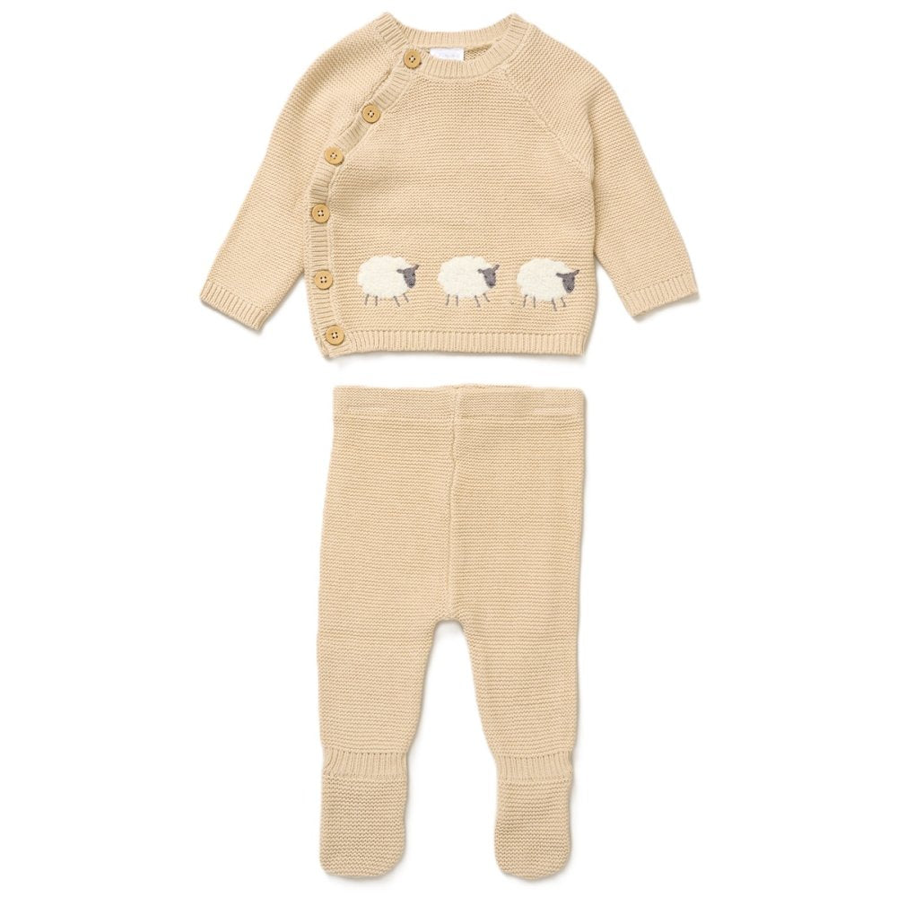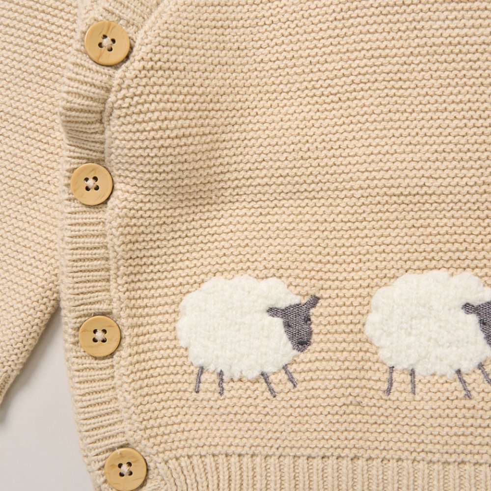 Keep your little one cozy and cute in this playful unisex knitted 2-piece outfit. The beige top features a delightful trio of sheep and a convenient side button opening for easy dressing. Paired with matching footed pants, this set offers warmth and comfort, perfect for nap time or playtime adventures.