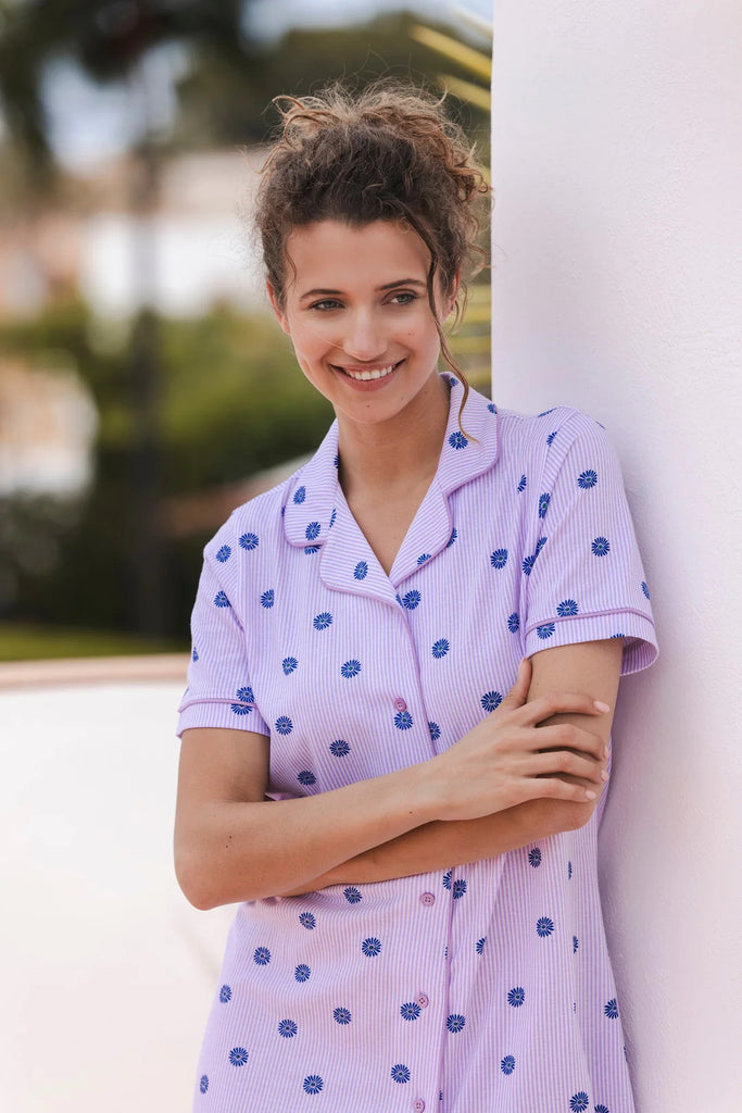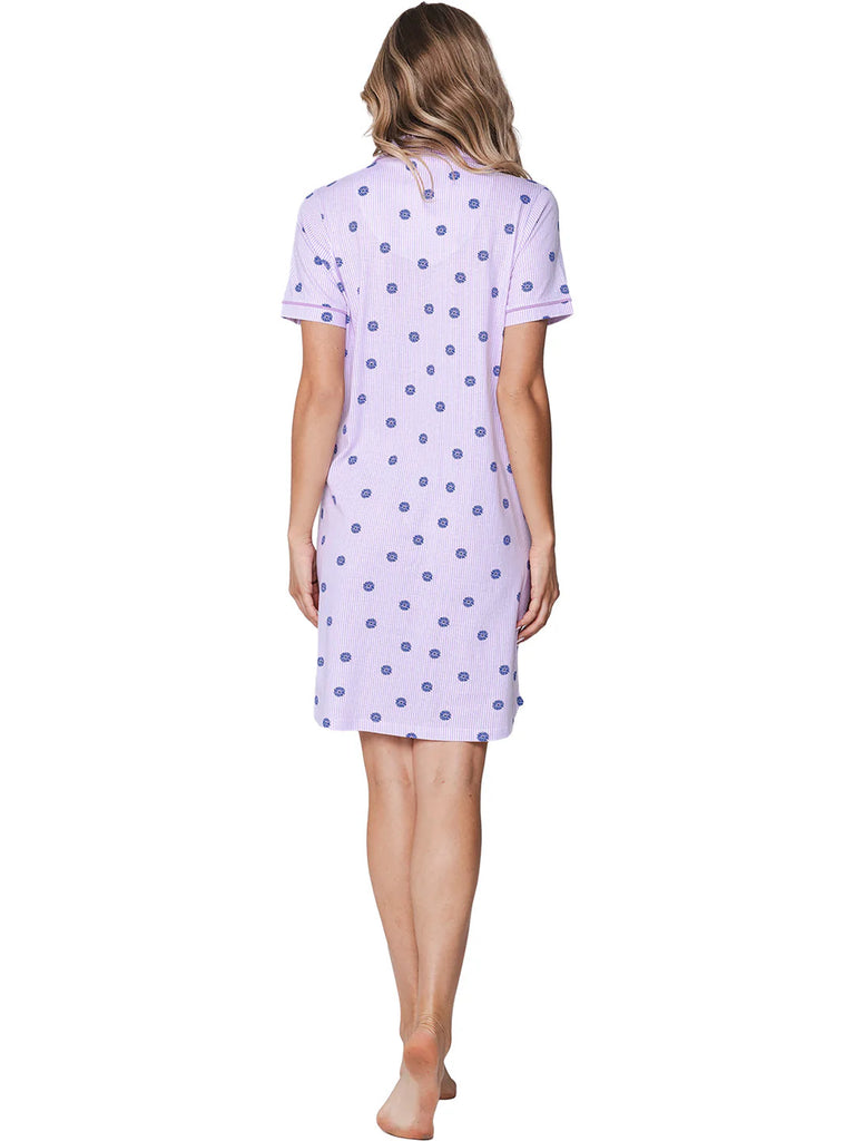 The nightgown is light purple and white striped and features an all-over purple floral print. It has short sleeves and a button closure. The collar gives it a stylish look. Playful details include the rounded hem and contrasting piping along the sleeves and neckline.