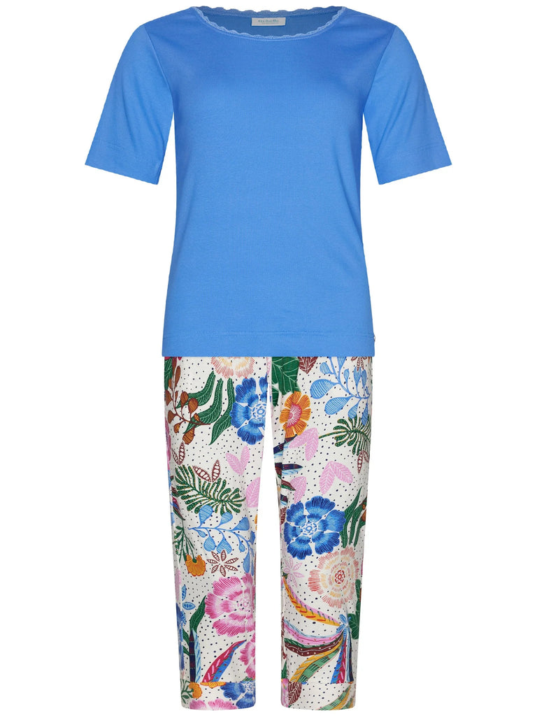 The two-piece set includes a top and cropped trousers. The top is a solid color in a fresh blue and features short sleeves and a round neck for a clean and comfortable look. The cropped trousers feature a colorful floral print, instantly creating a cheerful, summery vibe. Thanks to the elastic waistband, the trousers are wonderfully comfortable and move smoothly with you. An added bonus: the trousers have front pockets.