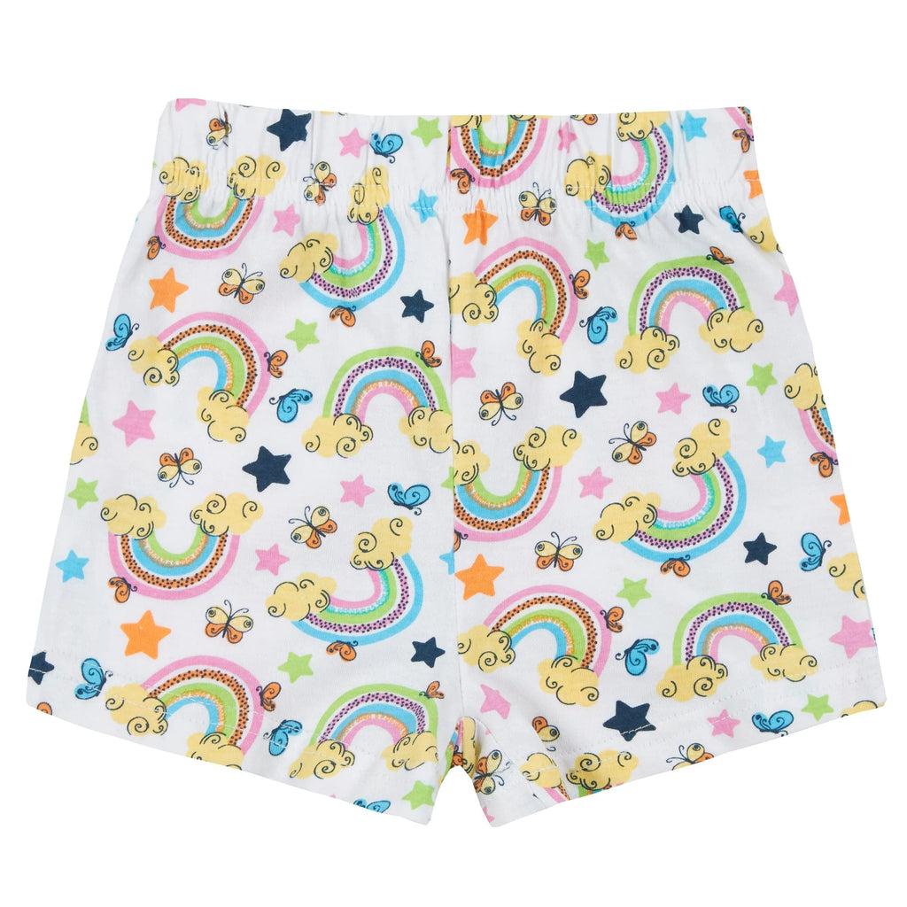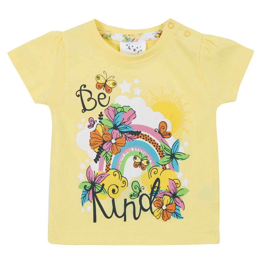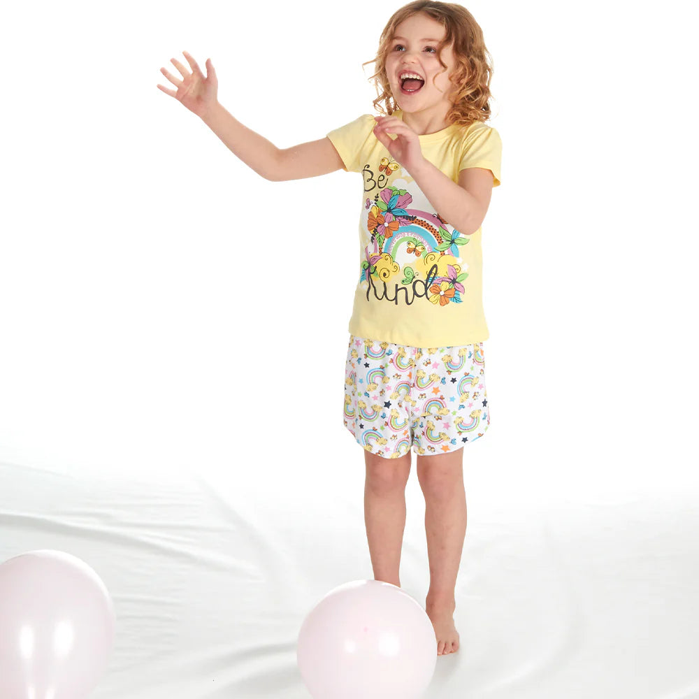 This adorable 2-piece summer set is a great addition to your baby girl's summer wardrobe. The all-over rainbow printed shorts feature an elasticated waistband and the yellow short sleeve top is printed with a 'Be Kind' floral rainbow graphic.