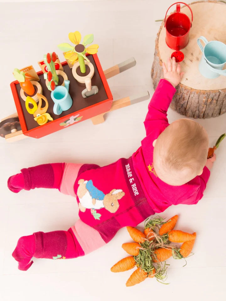 Introducing the adorable and vibrant Peter Rabbit Autumn Leaf leggings for your little one! These leggings feature a stylish striped pink pattern and are adorned with a playful Peter Rabbit print on the bottom.