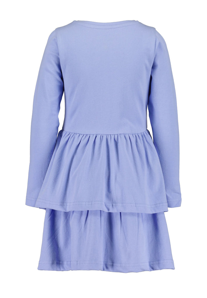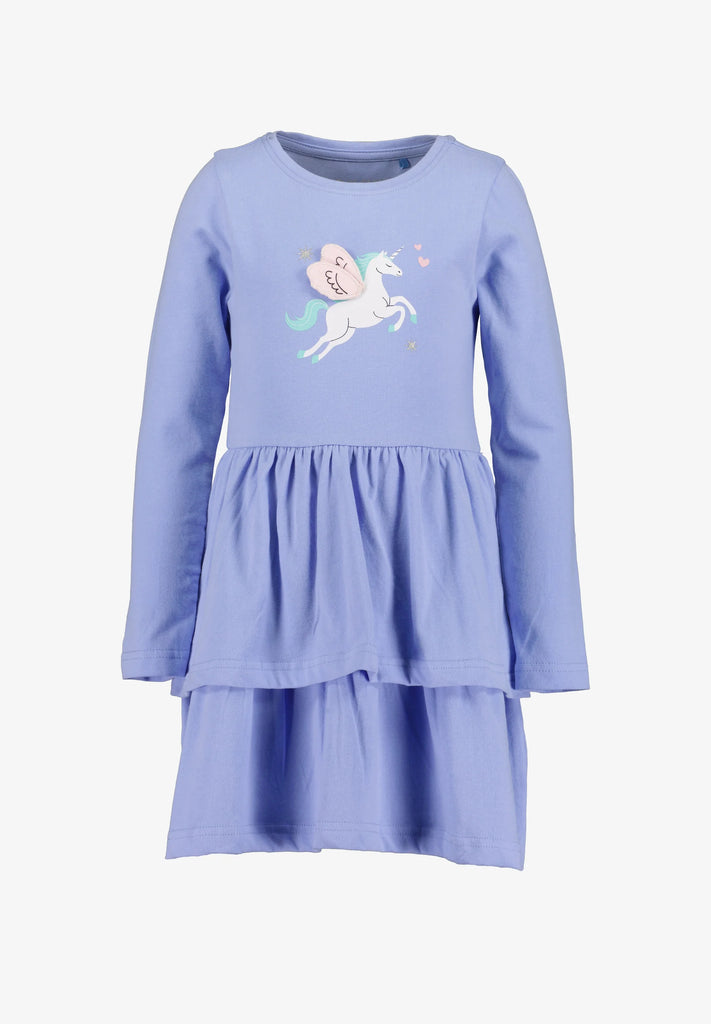 This playful purple cotton dress for girls features long sleeves and a round neckline, decorated with a charming flying unicorn print on the front from Blue Seven. Perfect for casual fun!