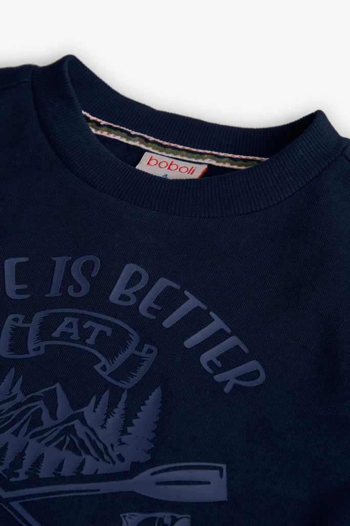 Navy blue fleece sweatshirt for boys, ideal for the fall and winter seasons, made of high-quality cotton that guarantees warmth and comfort. It features an exclusive design on the front with oars and landscapes, perfect for inspiring an adventurous and natural spirit. With a round neck and long sleeves, it's the perfect choice for cold days, easily pairing with casual pants for a relaxed and modern look. Available in sizes from 2 to 14 years, this sweatshirt is not only distinguished by its style, but also by its practicality and comfort.