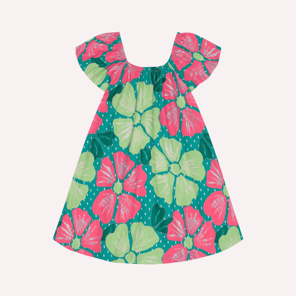 Made in half mesh 100% cotton, it presents a wide modeling and a print in maxi flowers, highlighting the delicacy of the flowers in a modern proposal. The cliff with folded elastic and wide sleeves offer a loose and comfortable look, ideal for the warmer days. The bar with sheath ensures an impeccable finish, making this dress a lovely choice for girls who love to be fashionable.