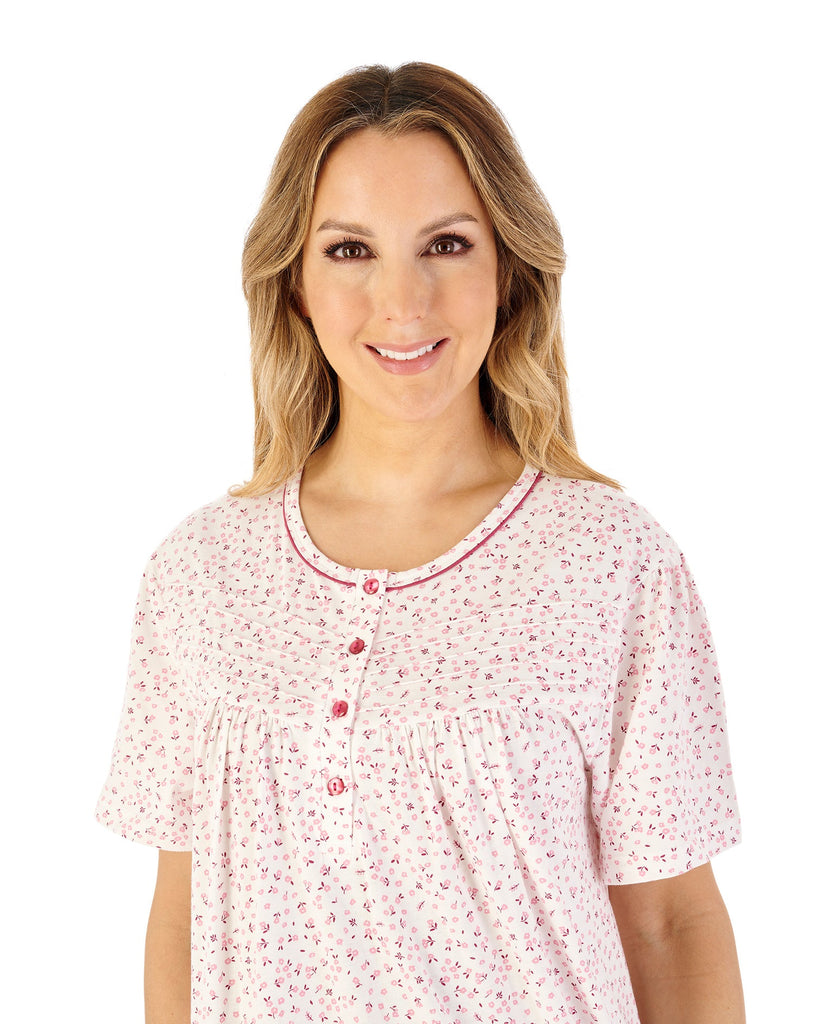 Made from 100% cotton jersey, this 42" nightdress combines breathable comfort with elegant detailing. It features an allover ditsy print, short sleeves, and a round neck accented by solid colour piping. The pintuck detail on the V-yoke and a 4-button placket add subtle sophistication, making it a refined choice for comfortable nightwear.